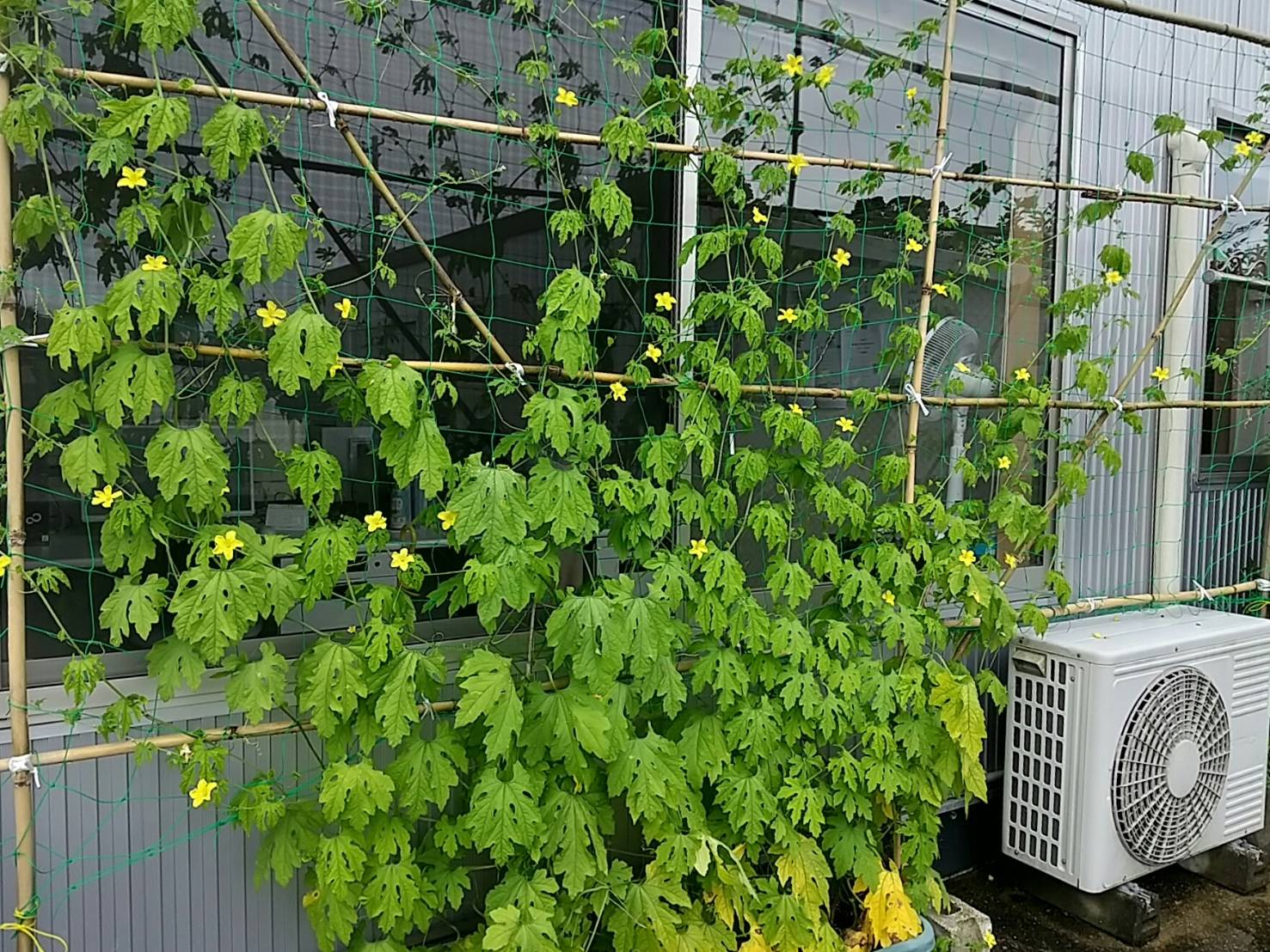 こちらの窓は西日がとても強いのです。 緑のカーテンを私とY社員で作成いたした結果 とても元気よく縦横にツルが伸びてくれました。おまけにゴーヤの実もそろそろ収穫できそうで、一石二鳥の嬉しさです。