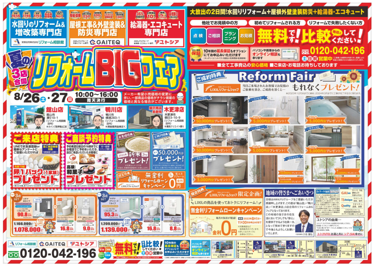 記事をシェアする チラシ 2024.08 リフォーム大相談会開催【AW-011】 2024.08.23 2409_awajyu ダウンロードはこちら 8月31日(土)・9月1日(日)の2日間、 リフォーム相談館館山店・鴨川店・木更津店の3店合同の「秋のリフォームフェア」を開催いたしします。 今回もたくさんの特典をご用意しておりますので、皆様多数のご来店を心よりお待ちしております。 広報/土井 前のページに戻る 2024.08 安房住まいるvol.36 2024.09 ユトシアチラシ【YU-005】 この記事のタグ GAITEQ イベント情報 ユトシア リフォーム相談館 土井智弘 木更津店 相続サロン 補助金情報 館山店 鴨川店 合わせて読みたい 2024.07 住まいのリフォーム相談会開催【AW-010】 チラシ 2024.06.26 3店舗合同「秋のリフォームフェア」開催! イベント 2024.07.30 2023.08 夏のリフォームBIGフェア開催! チラシ 2023.08.10 2024.01 レギュラーチラシ【AW-007】 チラシ 2024.03.30